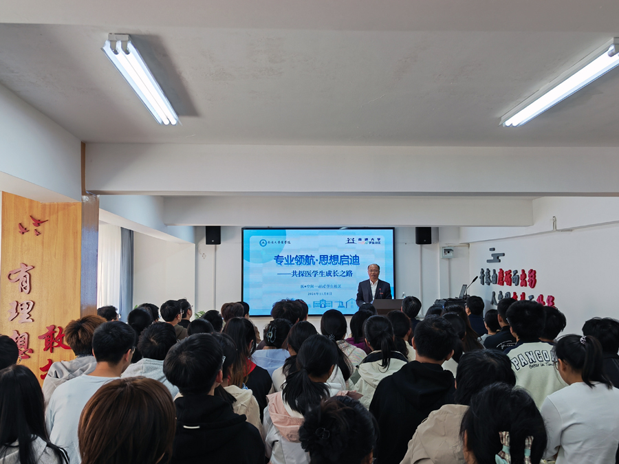 11月6日下午,学院在“医+空间”一站式学生社区召开“专业领航·思想启迪”基础医学专业思想教育大会,邀请校党委副书记、校长杨宇民教授为全体2024级基础医学专业本科生作专题讲座。