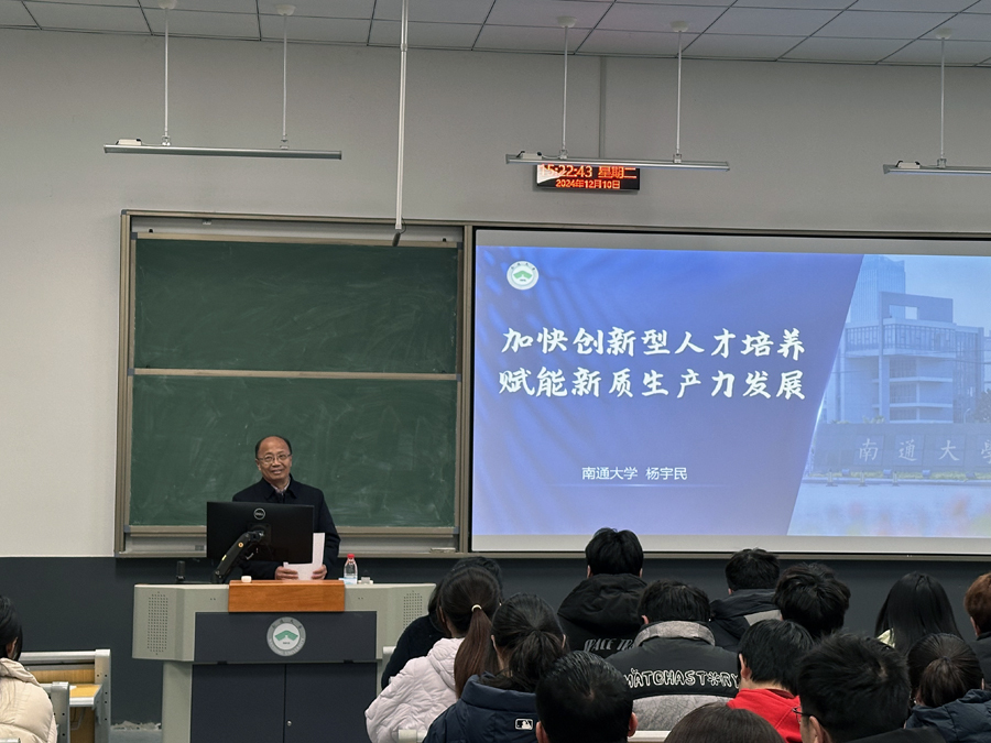 杨宇民紧紧围绕“深刻理解新质生产力的核心要义”开展课程,他强调,新质生产力是以创新为主导,具有高科技、高效能、高质量特征的先进生产力,是高质量发展的必由之路。重点探讨了“发展新质生产力”与“加快创新人才培养”之间的紧密关联。他指出,创新人才是新质生产力的创造者和使用者,是生产力生成中最活跃、最具决定意义的能动主体,同时立足实际,结合南通大学的具体情况,为同学们介绍了学校在创新人才培养方面的举措和成效,并鼓励大家努力提高自身素质和技能,力争成为新质生产力的第一要素和最基本的驱动力量。