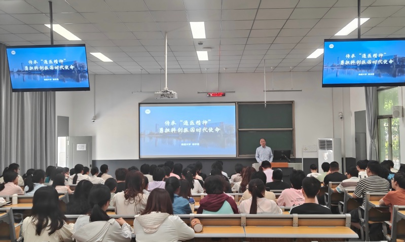 杨宇民从大型原创话剧《通医人》导入,介绍了学校的悠久历史和优良传统,分享了以顾晓松院士、汤锦波教授为代表的“通医优秀青年知识分子群体”的动人事迹和他们的科创报国之路,畅谈了“科创报国”在医学领域的时代内涵与使命担当。他给大家提出四点希望:一要筑牢理想信念之基,锚定报国医学航向。深入学习理论,汲取精神力量,树立远大志向,明确人生坐标;二要夯实专业知识之本,锤炼科创报国之能。勤学苦练,打下坚实专业基础,培养创新思维,拓展学术视野;三要勇于科研实践探索,点燃科创报国之火。通过多样化的科创实践平台和机会,尝试科研探索,积累宝贵经验;四要涵养高尚医德医风,践行时代使命担当。坚守医者仁心,尊重生命价值,弘扬科学家精神,锤炼过硬作风。